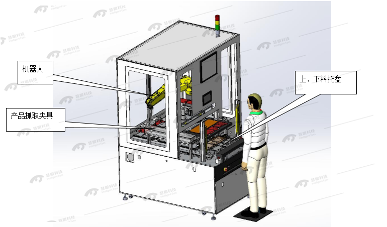 针对这种情况,慧眼科技针对市场需求,自主研发了一台用压合设备,是基于视觉原理搭载机器人的自动压合设备,能实现塑料板玻璃板贴合以及压合的功能,提高了玻璃板贴合精度。此外,上下模的设置允许在一模进行压合的同时,另一模上下料,极大地提高了生产效率。